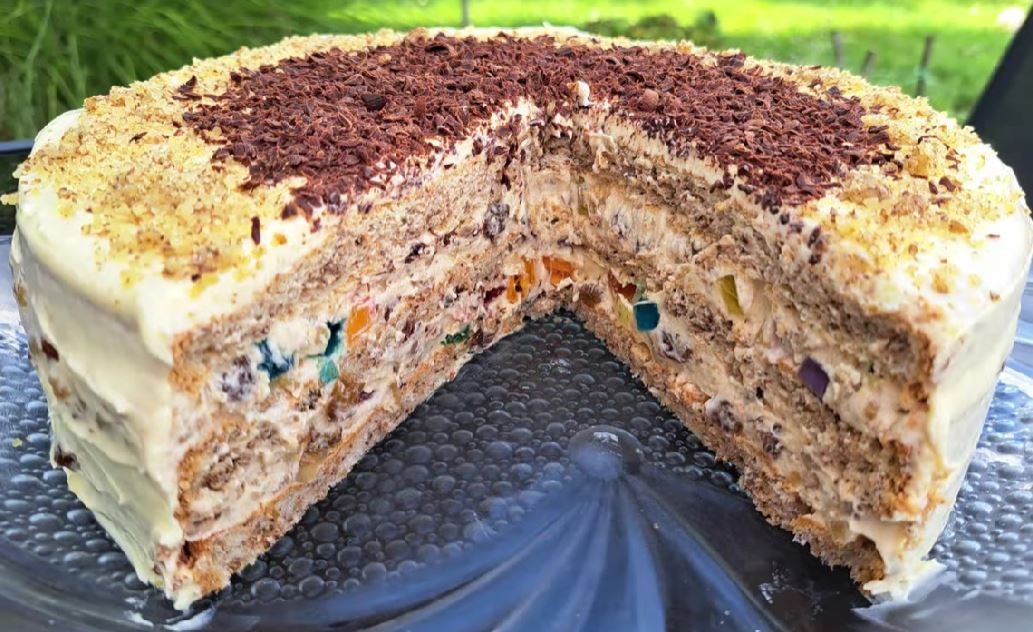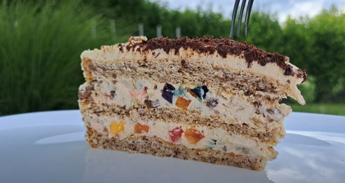 Kada je fil gotov, odvojite 1/3 fila i ostavite ga bez dodataka. U preostali fil dodajte seckane orahe, žele bombone i suvo grožđe, pa dobro promešajte. Sada je vrijeme da spojite biskvit i fil. Na ohlađeni biskvit ravnomerno rasporedite fil sa dodacima, a na vrh stavite odvojeni žuti fil. Ovaj složeni desert možete ukrasiti dodatnim seckanim orasima ili bombonama, što će mu dati dodatni vizuelni šarm. Preporučuje se da se biskvit reže na male kockice radi lakšeg serviranja. Savršeno se slaže s šoljom kafe ili čaja, dok bogati ukusi fila i biskvita stvaraju veličanstveni užitak za vaša čula.